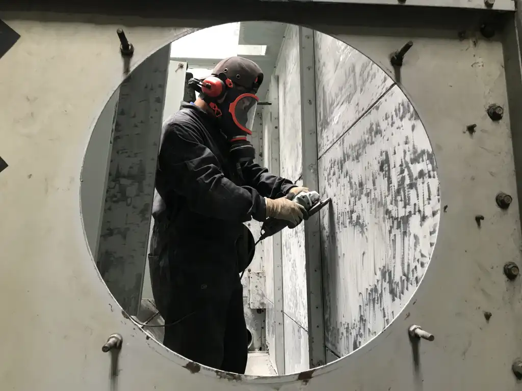 Une fois les surfaces préparées, nos techniciens ont appliqué une peinture Epoxy issue de notre partenaire Color Industrie sur les parties haute de ruissellement de la tour de refroidissement et une résine Polymère tri composants de base Vinylester dans les bacs de rétention d’eau.